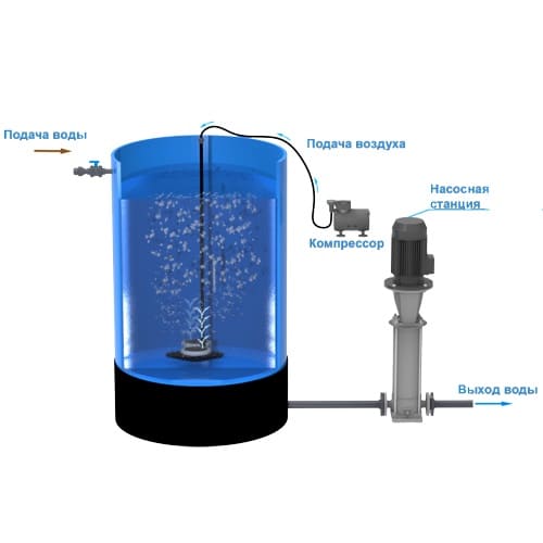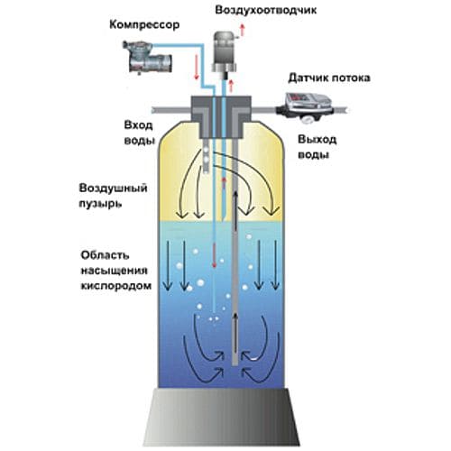 В процессе аэрации происходит обогащение воды кислородом, в результате чего окисляются вредные металлы. Аэрация устраняет не только вредные вещества, но и неприятно пахнущие химические соединения, например, сероводород, аммиак, метан, углекислоту. Наиболее часто аэрация применяется для обезжелезивания воды. Кислород, взаимодействуя с железом, увеличивает его валентность, делая металл нерастворимым, в результате чего при последующей фильтрации осадок задерживается. Напорная аэрация происходит в специальных аэрационных колоннах. Колонна аэрации воды имеет автоматический клапан, предназначенный для выведения избыточных газов и кислорода. Верхняя часть емкости имеет свободное пространство, предназначенное для задержки кислорода, причем, из-за соприкосновения воздуха с поверхностью воды производится дополнительная аэрация. Безнапорная аэрация происходит в открытых емкостях. На дне емкости располагаются форсунки, через которые нагнетаются пузырьки воздуха. После аэрации вода проходит через фильтры, предназначенные для задержки окислившегося железа, марганца и других нерастворенных веществ.