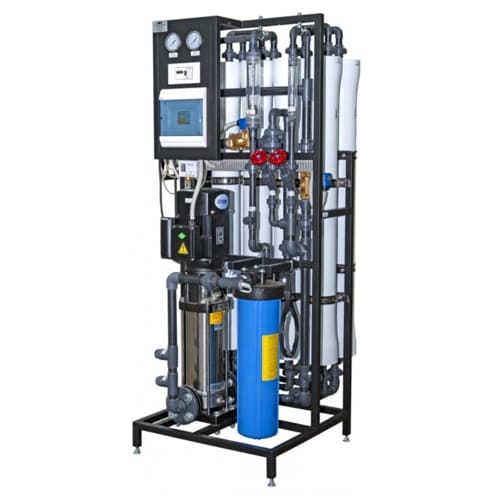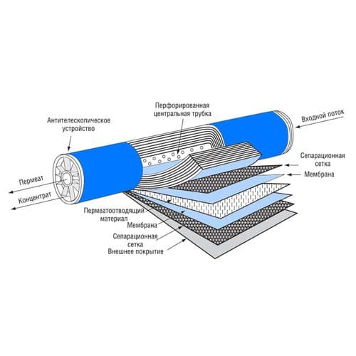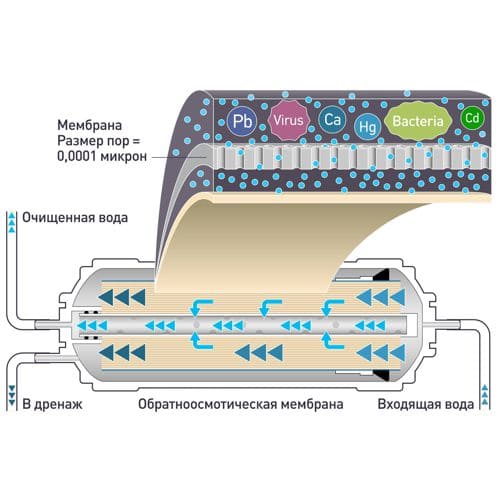 Обратный осмос относится к наиболее перспективным, эффективным и широко применяемым методам очистки и подготовки воды. Установка обратного осмоса способна удалять из воды частицы с размерами 0,001-0,0001 мкм. В этот диапазон попадают соли жёсткости, сульфаты, нитраты, ионы натрия, малые молекулы, красители. В процессе обратного осмоса вода под давлением проходит через синтетическую мембрану, задерживающую примерно 98% загрязняющих веществ, солей и примесей. Мембрана состоит из селективного слоя - самого барьера для примесей, и армирующего слоя, который влияет на прочность мембраны. Они производятся из ацетата целлюлозы, армированного полиамида или тонкопленочных композитов. Через мембрану проходят практически только молекулы воды, а все остальные вещества остаются с неотфильтрованной водой или на поверхности мембраны, откуда со временем просто смываются через специальный патрубок в дренаж.